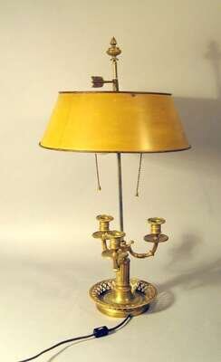 The three scrolling candlearms issuing from a column base with a central stem and adjustable tole shade, on a dished circular base; electrified.