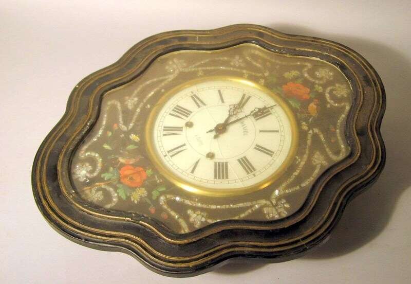 French mother-of-pearl inlaid, painted and ebonized wall clock petit daniel, paris, late 19th century