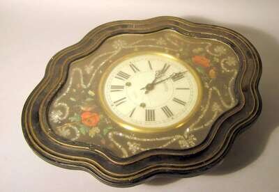 Of shaped cartouche form, the white enamel Roman numeral dial set in a floral painted and mother-of-pearl inlaid surround.