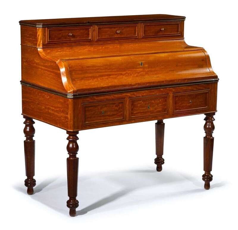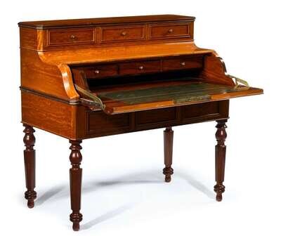 Two parts: the rectangular superstructure with three short drawers, over a shaped pull-out drawer revealing a rosewood interior and green tooled leather writing surface; the lower section with three short drawers, raised on turned and tapered legs.