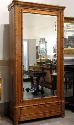 The tall rectangular 'bamboo' carved case enclosing a large beveled mirrored door, above a single paneled drawer, raised on cylindrical feet.
