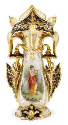 The waisted body beneath a foliate gilt mouth, the body painted with a Classical maiden playing a harp and applied with leaves and tendrils; impressed marks.