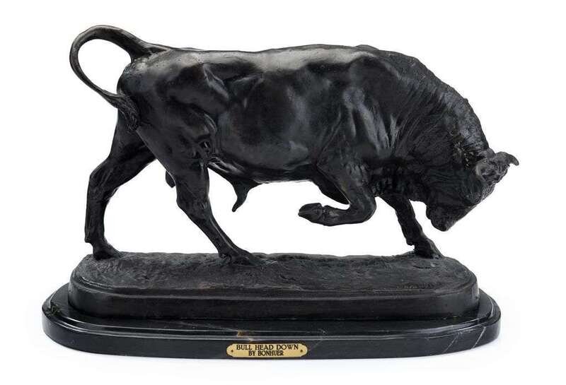 Bronze, medium brown patina, modeled standing with its head down, on a naturalistic oval base inscribed 'I. Bonheur', raised on a black marble base.