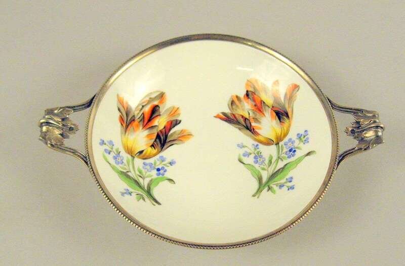 The circular dish painted with tulips and mounted with a silver beaded rim with acanthus handles; blue crossed swords mark and standard French silver marks to mounts.