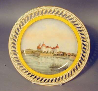 With a central painted scene of a chateau, enclosed by a yellow band and gilt highlighted pierced rim; underglaze blue crossed swords mark.