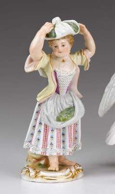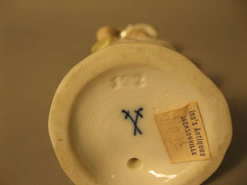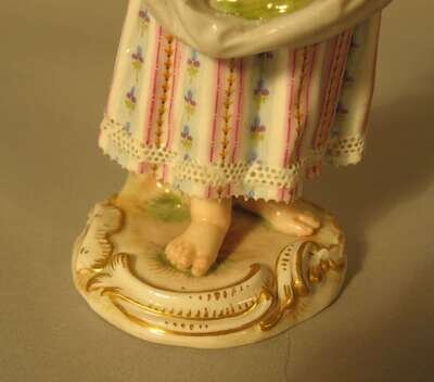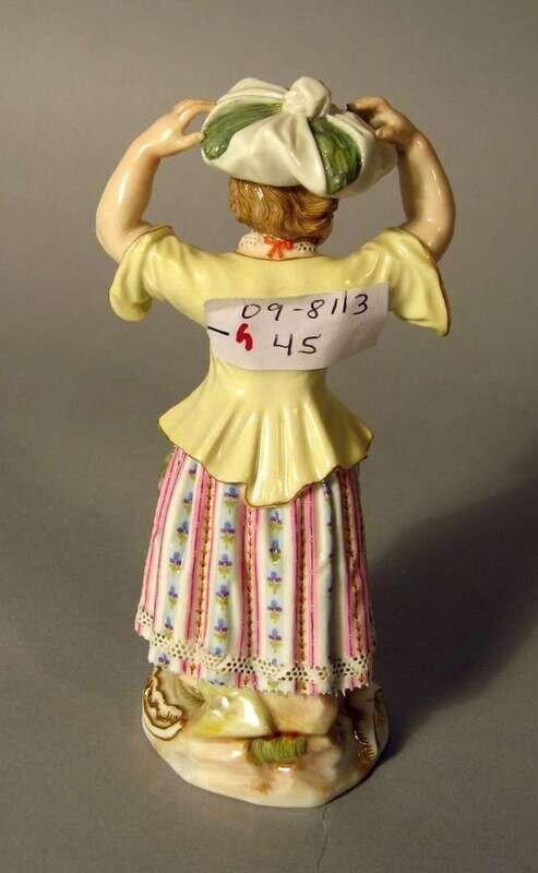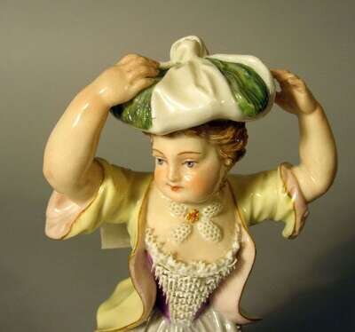 Modeled as a young girl, her hands raised holding her hat, in a striped and lace applied dress, blue underglaze swords mark.