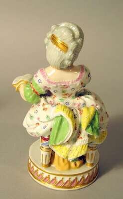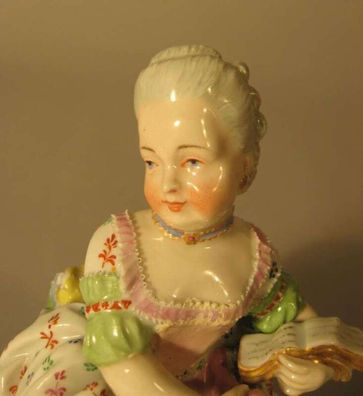 The figure seated on a stool and holding a book in her left hand, impressed and blue underglaze crossed swords mark.