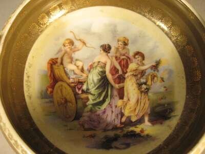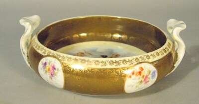 The shallow circular dish with loop handles and centrally painted with Cupid in a chariot being drawn by nymphs, the exterior with floral circular reserves on a green ground with gilt details, red printed mark.