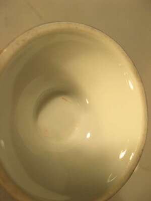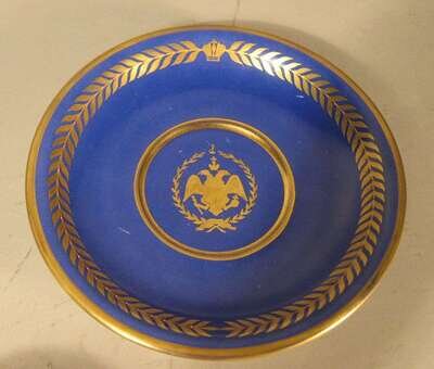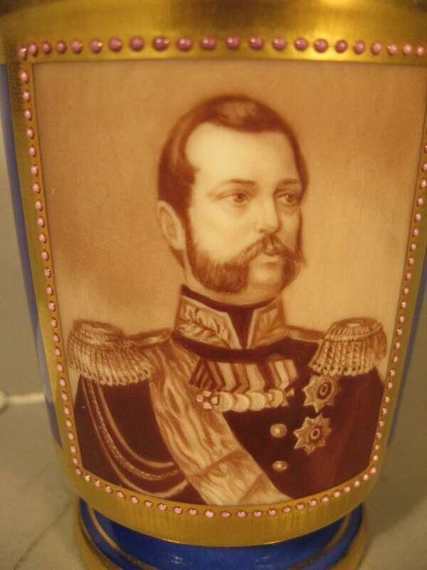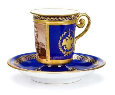 The cup painted with a sepia portrait of Alexander II on a blue ground with raised puce beads and gilt Imperial eagles, the saucer with a gilt laurel wreath band, crown and Imperial eagle, rubbed etched Cyrillic initial mark 'MFZ' with traces of red.