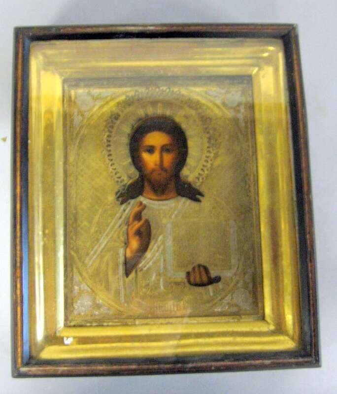 With a silver gilt oklad with pierced corona, mounted in a shadow box frame.