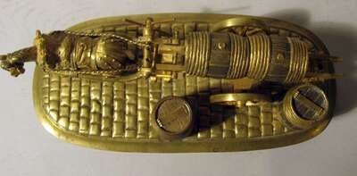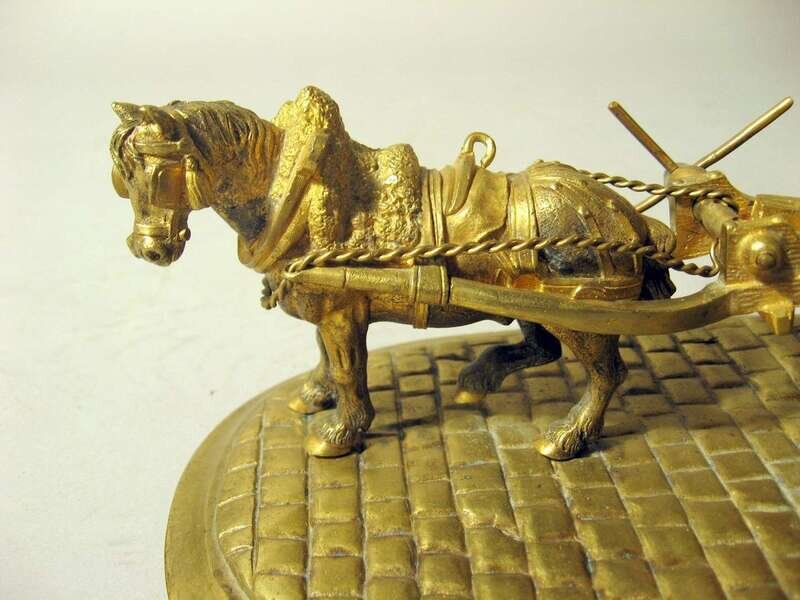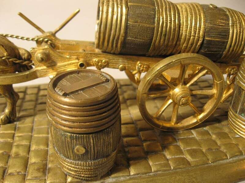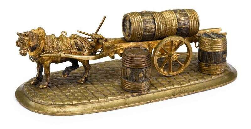 Modeled as cart horse pulling a wagon laden with water barrels, on a rectangular base, unsigned.
