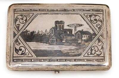 Comprising three late 19th century Russian examples engraved with flowers, scrolls and geometric bands, one depicting a church, stamped 84 standard; a Dutch example in the form of a book, marked sterling standard; and an American Clarence A. Vanderbilt sterling silver foliate engraved and monogrammed case. (5).