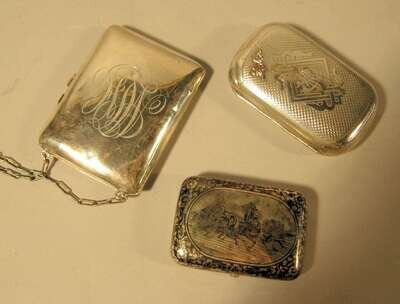 Comprising a Russian niello silver case with a troika scene, inscribed 'Moscow 1888'; a silver change purse with an engraved monogram and applied gold 'Yda', probably Russian; and an American sterling silver change purse dated '1918'. (3).