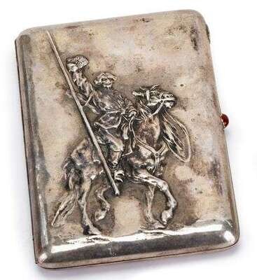 Rectangular, the cover in relief depicting a cossack on horseback, cabochon thumbpiece, stamped '84'.