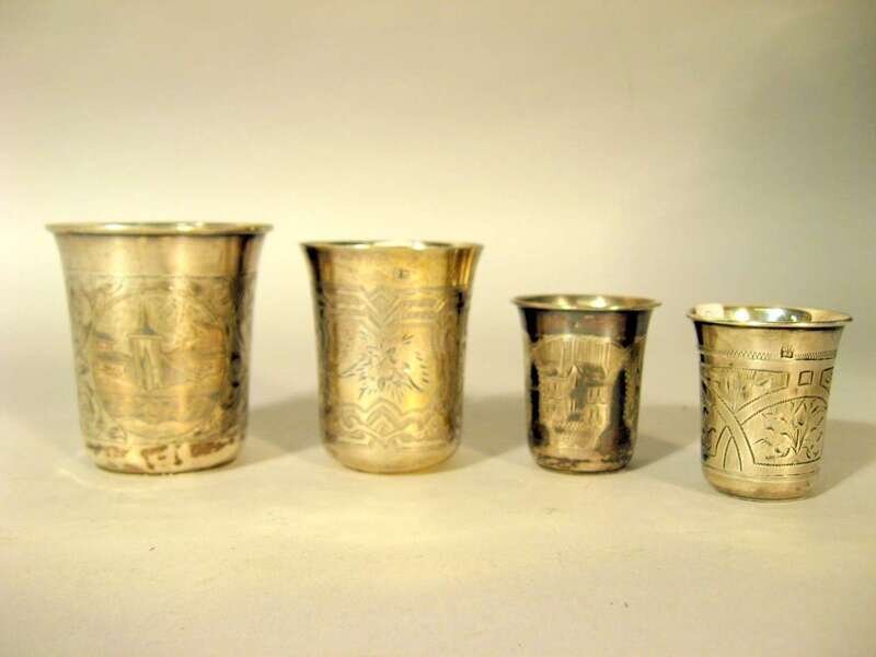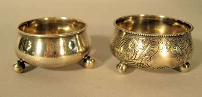Comprising two open salts and four vodka cups; one salt with Cyrillic maker's mark for Ivan Khlebnikov, monogrammed 'CM' with coronet and dated 1884; the other with foliate engraving and Cyrillic maker's mark, possibly Pyetr Abrosimov, dated 1894; both stamped 84 standard and raised on ball feet.(6).