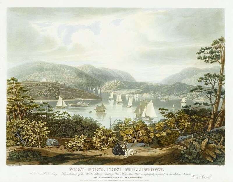Hand-Colored Engraving. Bennett, W(illiam) J(ames). "West Point from Phillipstown." New York: Lewis P. Clover, 1831. 19 3/4 x 25 3/8 inches (500 x 644 mm). Some toning to edges, a few small repairs to verso of upper margin. Image clean & attractive.