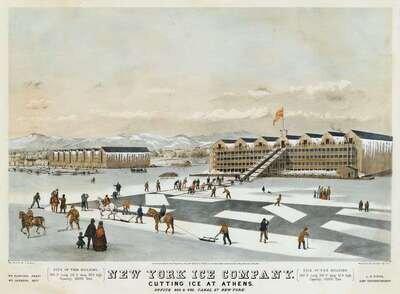 Hand-Colored Lithograph. Endicott & Co. after Hill, John W. "New York Ice Company - Cutting Ice at Athens." (New York), 1847. 18 7/8 x 26 inches (479 x 660 mm) - sheet size. A few expertly repaired small tears in margins, edges very slightly discolored. Image bright, clean & attractive.