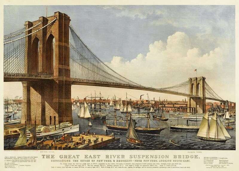Color Lithograph. Currier, N.; Ives, J.M., publisher. "The Great East River Suspension Bridge." New York, 1877. 28 3/4 x 39 1/4 inches (730 x 995 mm) - sheet size; 23 x 33 inches (584 x 838 mm) - image & text. Slightly toned, linen-backed. Image clean & attractive.