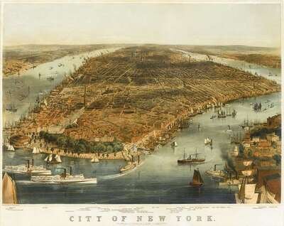Hand-Colored Lithograph. Currier, N., publisher. "City of New York." New York, 1856. 24 1/8 x 30 5/8 inches (612 x 779 mm) - sheet size; 22 1/4x 28 1/4 inches (565 x 717 mm) - image & text. Lightly to moderately toned, minor creasing & a little dust soiling outside of image. Image generally clean & attractive.