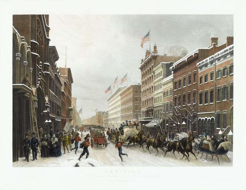 Hand-Colored Aquatint Etching. Sebron, Hyppolyte Victor Valentine. New York. Winter Scene In Broadway. New York: M. Knoedler, 1857. 27 1/2 x 37 1/4 inches (698 x 946 mm), margins. Mounted at edges, very minor mat burn, but bright, clean & attractive.