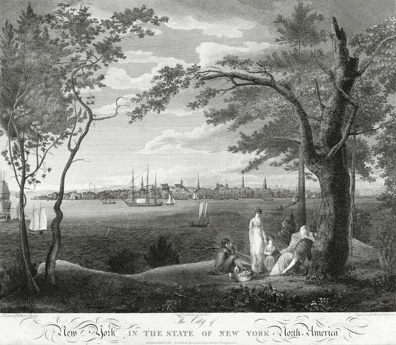 Engraving. Seymour, Samuel after Birch, William. "The City of New York in The State of New York North America." Springfield Near Bristol, Pennsylvania, Jan. 1, 1803 [but ca. 1820]. 21 1/4 x 25 5/8 inches (540 x 650 mm), narrow margins. Minor edge wear, a few small close tears in margins. Clean & bright.