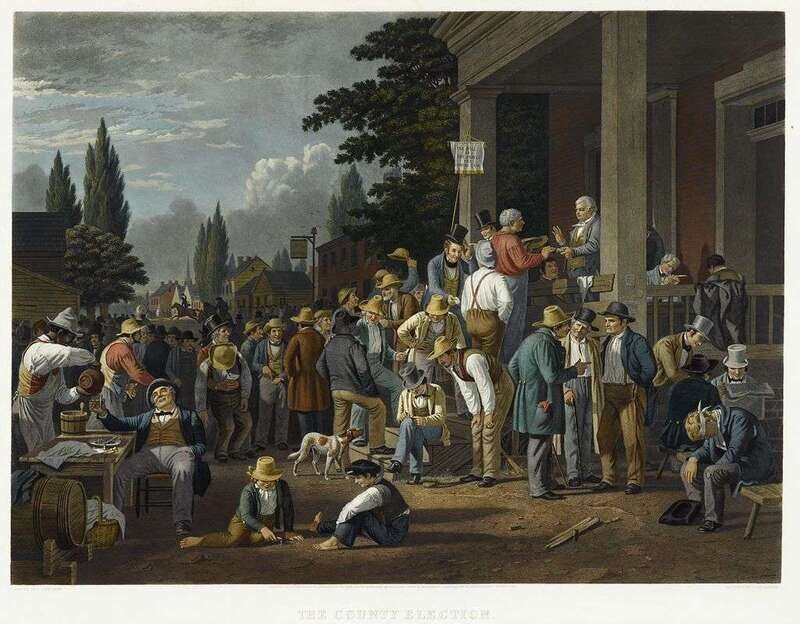 Hand-Colored Engraving. Sartain, John after Bingham, Geo. C. "The County Election." New York, 1854. 25 1/2 x 32 inches (647 x 812 mm), wide margins; 22 3/8 x 29 5/8 inches (568 x 752 mm) - image size. Very slightly toned, mat burn affecting edges only. Image clean & attractive.