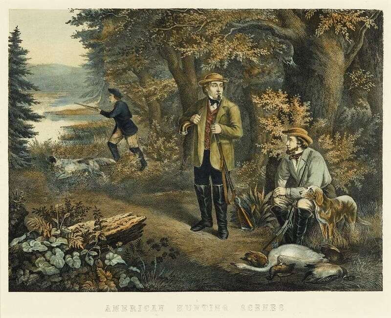 Color Lithograph. "American Hunting Scenes." N.p., n.d. [ca, 1870]. 24 1/4 x 28 1/2 inches (615 x 724 mm) - sheet size; 18 x 22 1/8 inches (457 x 562 mm) - image & text. Clean & attractive.