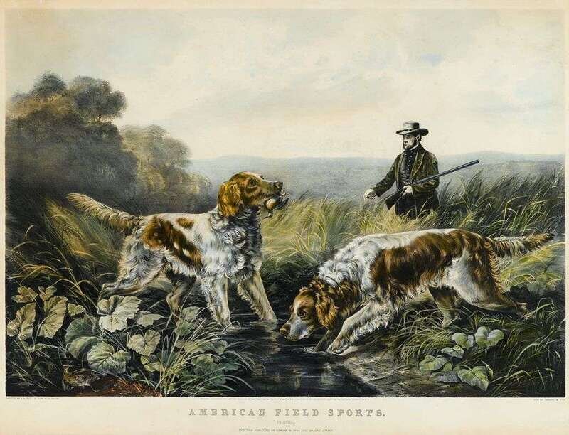 Hand-Colored Lithograph. Currier, N.; Ives, J.M., publisher. Tait, A.F., after. "American Field Sports. 'Retrieving'." New York, 1857. 20 1/8 x 26 5/8 inches (510 x 676 mm) - text & image; 21 1/2 x 28 3/4 inches (546 x 730 mm) - sheet size. Light to moderate toning, a few small abrasions outside of image. clean & attractive.