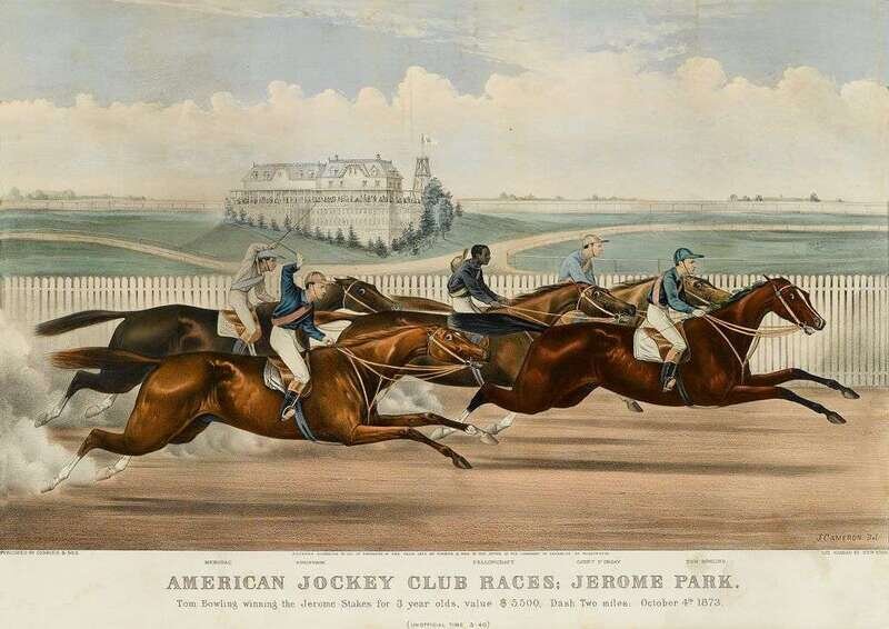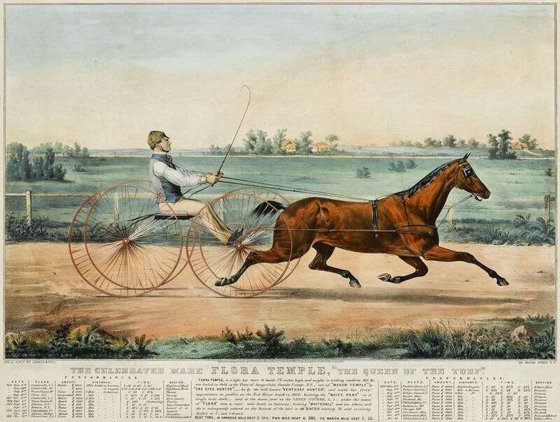 Hand-Colored Lithographs. Currier, N.; Ives, J.M., pub.: Cameron, J after. "American Jockey Club Races: Jerome Park. Tom Bowling Winning... October 4th, 1873." New York, 1873. 18 3/4 x 26 inches (476 x 660 mm) - text & image. Occasionaly minor dampstaining, image generally bright & clean. Gale 0188. * "The Celebrated Mare Flora Temple, 'The Queen of The Turf'." New York, 1853. 20 1/8 x 26 1/2 inches (511 x 673 mm) - text & image. Image generally clean & attractive. Gale 0982. Both examined out of frames but not out of heavy mats.R>