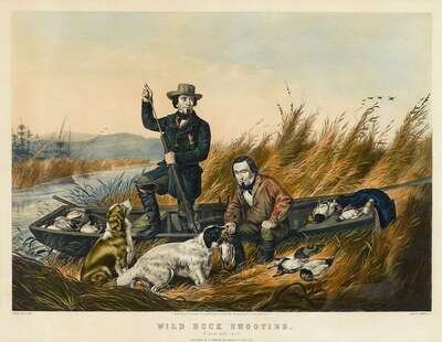 Hand-Colored Lithograph. Currier, N., publisher. Tait, A.F. "Wild Duck Shooting. A good day's sport." New York, 1854. 23 7/8 x 29 5/8 inches (606 x 755 mm) - sheet size; 20 x 25 5/8 inches (508 x 650 mm) - image & text. Light to moderate toning (heaviest along edges). Image clean & attractive.
