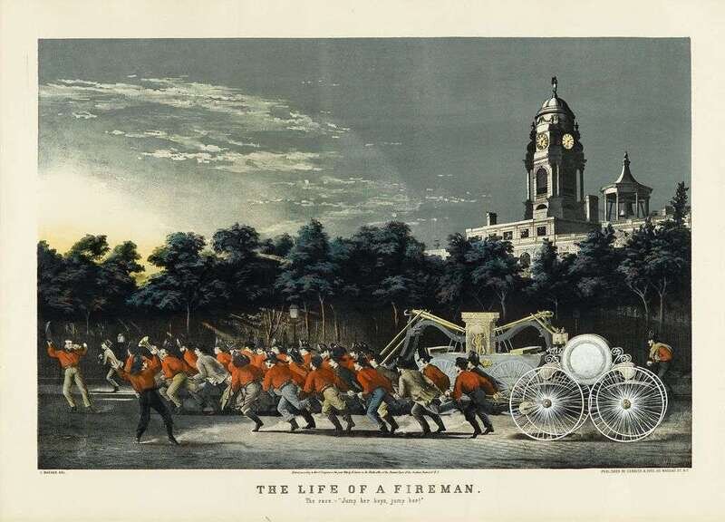 Hand-Colored Lithograph. Currier, N.; Ives, J.M., publisher. "The Life of A Fireman: The Race - 'Jump her, boys, jump her!'." New York, 1854. 21 3/4 x 29 3/4 inches (522 x 755 mm) - sheet size; 18 1/2 x 26 1/8 inches (470 x 663 mm) - text & image. Slightly toned, mounted & darkened along edges. Image clean & attractive.