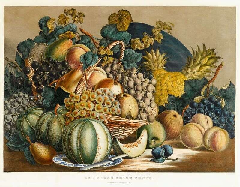 Hand-Colored Lithograph. Currier, N.; Ives, J.M., publisher. Palmer, F.P., after. "American Prize Fruit." New York, 1862. 23 1/2 x 30 3/4 inches (596 x 780 mm) - sheet size; 20 1/2 x 27 5/8 inches (520 x 700 mm) - text & image. Very slightly toned. Image clean & attractive.