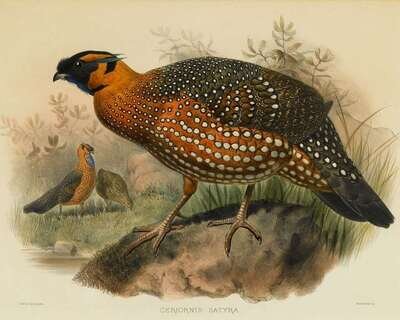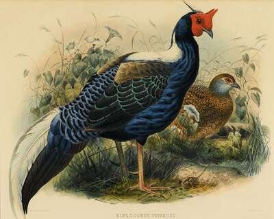 (Bird Prints.) Hand-Colored Lithographs. Wolf, J.; Keulemans, J.G., et al.: "Euplocomus Swinhoei." * "Ceriarnis Satyra." [Ca. 1875.] Both approx. 18 x 23 inches (457 x 584 mm). Moderate mat burn & toning, but images attractive & well-colored.R>