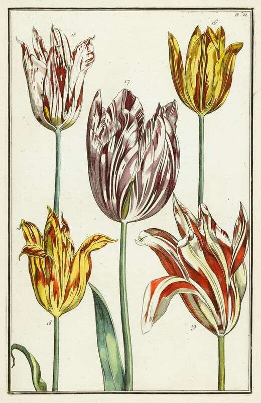 Hand-Colored Botanical Engravings: [Thornton, Robert J.] "Group of Carnations"; "Tulips." [Temple of Flora, London, 1812, 4to ed.]. Approx. 12 x 8 inches (305 x 203 mm). * Smith, E.D., after. Tulips. [London], [1827]. 8 plates, approx. 8 x 5 inches (203 x 127 mm). * Tulips. 18th-Century, 14 x 8 1/2 inches (356 x 216 mm). Modern color. All clean. Smith tulips framed in group of 5 & group of 3.R>