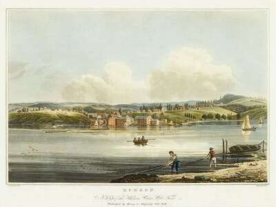 Hand-Colored Aquatint Etching. Hill, John after Wall, William Guy. "Hudson." New York: H.I. Megarey, [1825-26]. [Plate #5, Hudson River Portfolio.] 17 1/2 x 24 1/4 inches (445 x 615 mm); image size 14 x 21 inches (356 x 533 mm). Light toning outside image, generally clean & attractive.