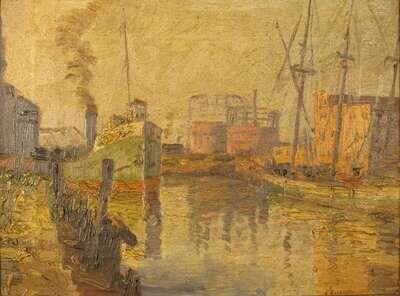 J. BEVSEVSKI (AMERICAN 20TH CENTURY) TUGBOAT IN HARBOR