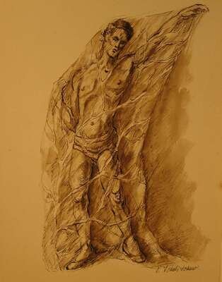 Signed bottom right, ink and sepia on cream wove paper