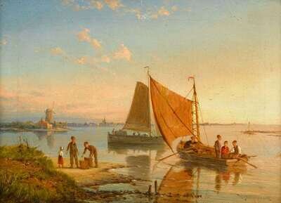WILLIAM RAYMOND DOMMERSEN (DUTCH 1850-1927) SAILING BOATS AND A ROW BOAT OFF A HARBORON THE DUTCH COAST