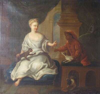 CONTINENTAL SCHOOL 19TH CENTURY INTERIOR WITH LADY, PETS AND SERVANT