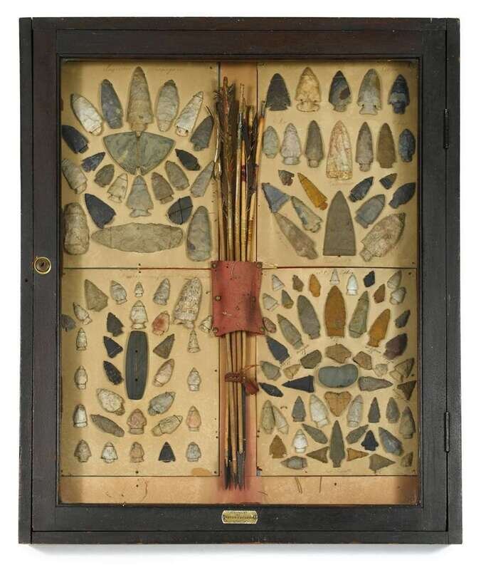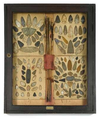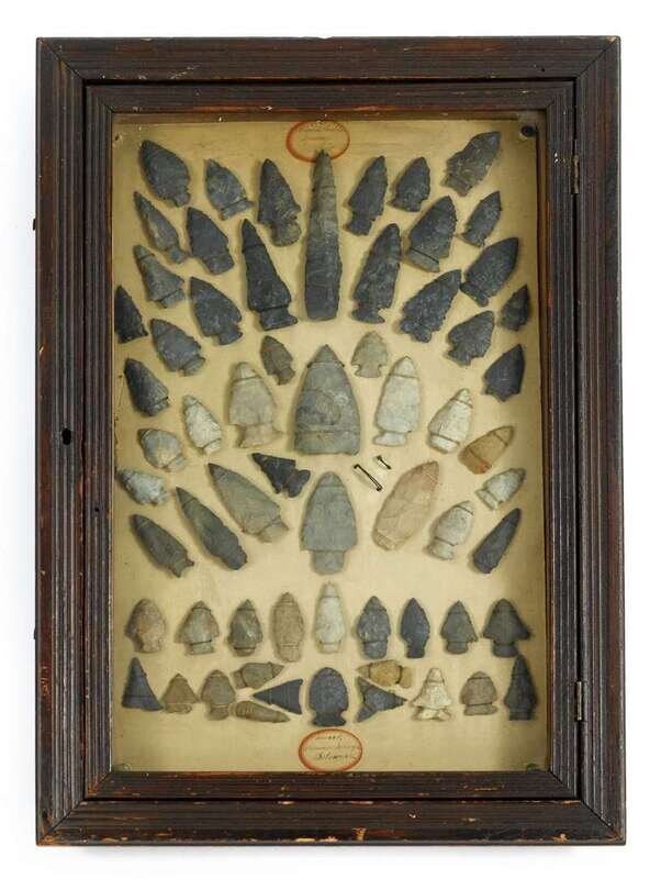 The first shadow box with arrangement of arrowheads, identified by handwritten labels, "From Cloud Auble Spencer Ohio" and "Herman Schaefer Newark Delaware," the second and larger shadow box with arrangement of arrowheads, tools and arrows, with inscriptions," Saginaw Michigan, Wisconsin, Mt. Ephron, Mt Laurel, Florida, Ohio and Tennessee."
