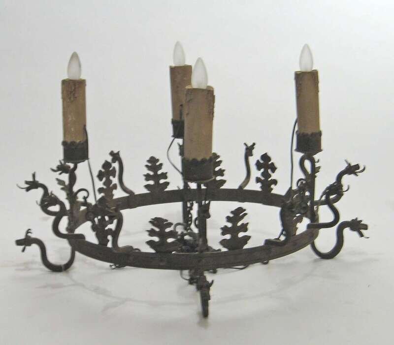The chain-hung circular form with dragon heads and leaves and four large candle cups.
