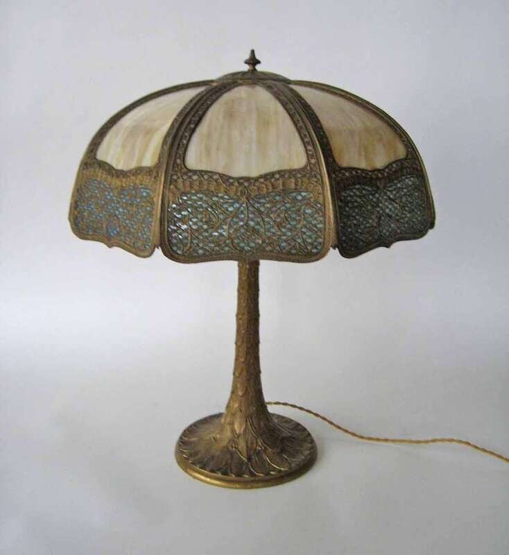 The domed shade with light yellow and blue glass panels with patinated metal overlay on a tapering leaf -decorated base.