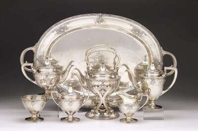 Comprising an urn form kettle-on-stand, coffeepot, teapot, waste bowl, cream jug, covered sugar bowl and two-handled tray, with shell and flowering basket borders.