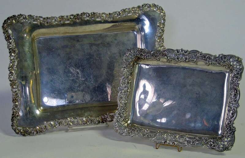 Slightly serpentine rectangular shape with pierced "pansy" border, together with a smaller rectangular tray with a floral border.