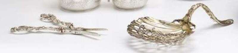 Pierced "shell" form bowl with oval "seaweed" handle, together with a pair of grape decorated shears.