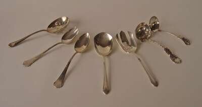 Two salad sets, pierced serving spoons, gravy and small ladles, 7 pieces.