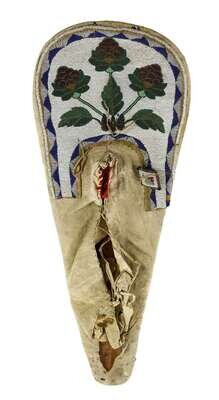 The oblong top beaded with sawtooth border enclosing flower spray and butterfly in white, blue, brown, metallic and green, fringed back.