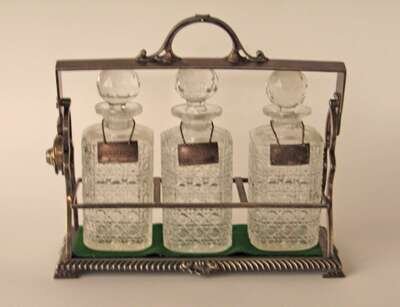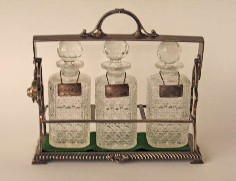 Three cut glass liquor bottles with cut glass stoppers having Stieff sterling silver liquor labels, stamped, "Williamsburg Restoration."