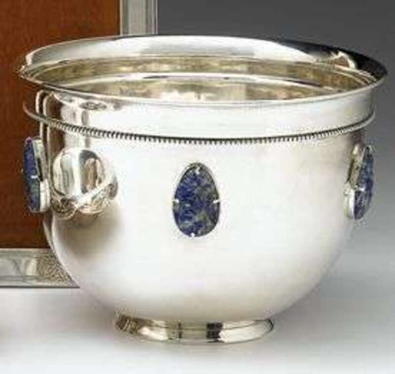 Rim with flaring lip and beaded band below. The sides are set with five pear shape carved lapis medallions. Signed on bottom.