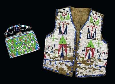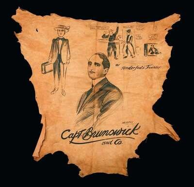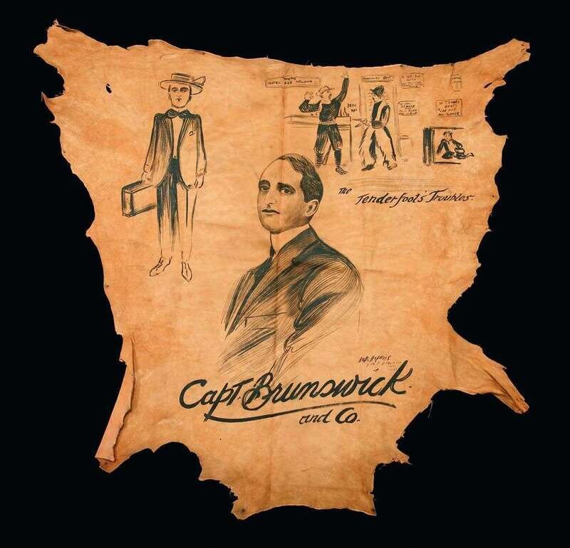 Including a handwritten and typed script for 'The Tenderfoot's Troubles' with corresponding materials: vaudeville posters and photos, a hide beadwork vest, a beadwork purse, a painted hide signed 'Bob Hopkins' decorated with figures, labeled 'Capt. Brunswick and Co.' and Tender Foot's Frontier'; together with a painted tapa cloth with central medallion enclosed by a double circle border.